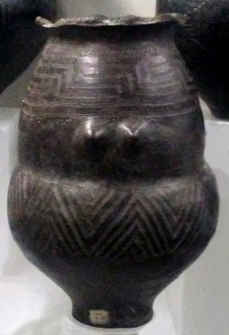 Japan: This one closely resembles the Iranian pot, but the patterns are incised rather than painted. Jomon period, circa 3000-1500 BCE