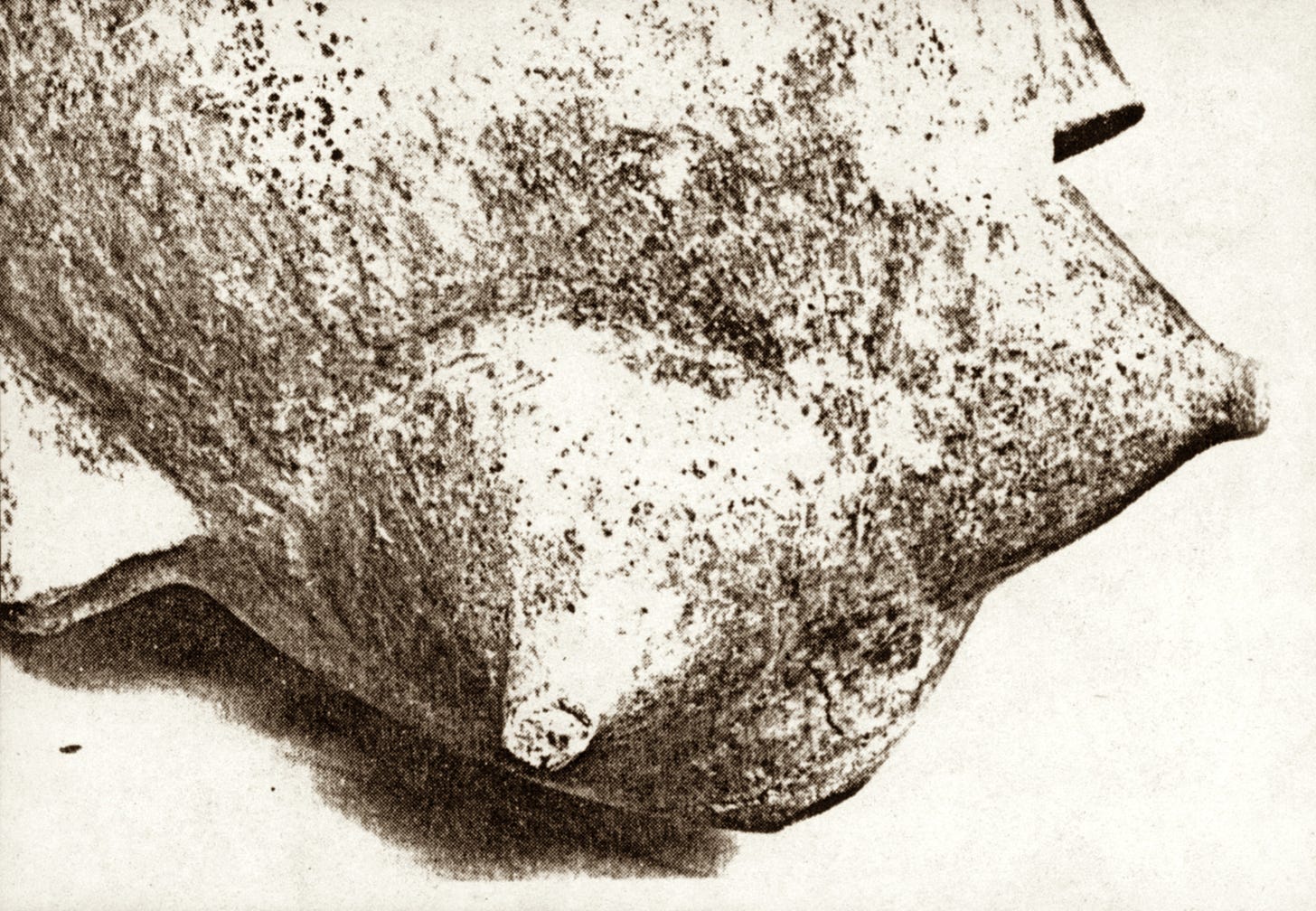 Crete: Another kind of breast-vessel belongs to an ancient Aegean style of very pointed breasts, often seen on female figurines or effigy vessels whose breasts are pierced to allow libations to flow through. Circa 2nd millennium bce.