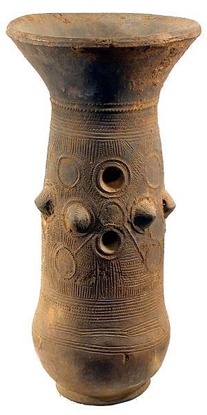 Yoruba: Breasted vessels are common in Nigeria; this one is an oil-lamp. Other Yoruba vessels are in the form of women with prominent breasts, sometimes nursing a child; others contain essence: sacred river water and pebbles. 20th century.