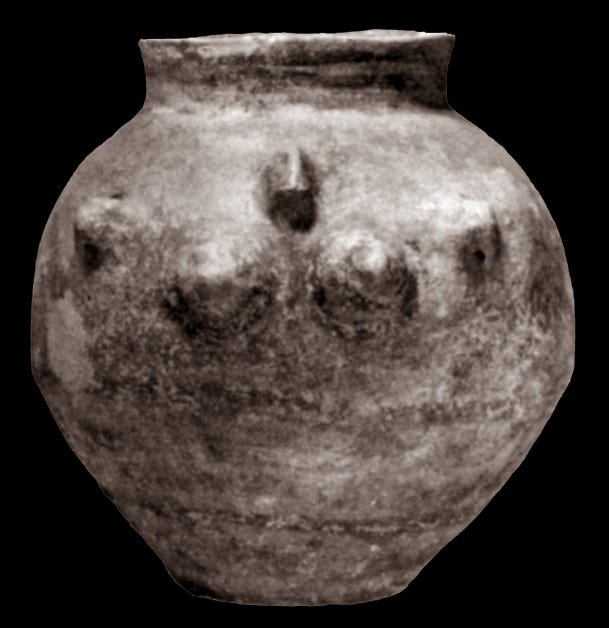 Tennessee: These pots with breasts going around the circumference are found in many countries. Another Tennessee pot has breasts only, no head. No location given and no photo available, circa 1000-1500 CE.