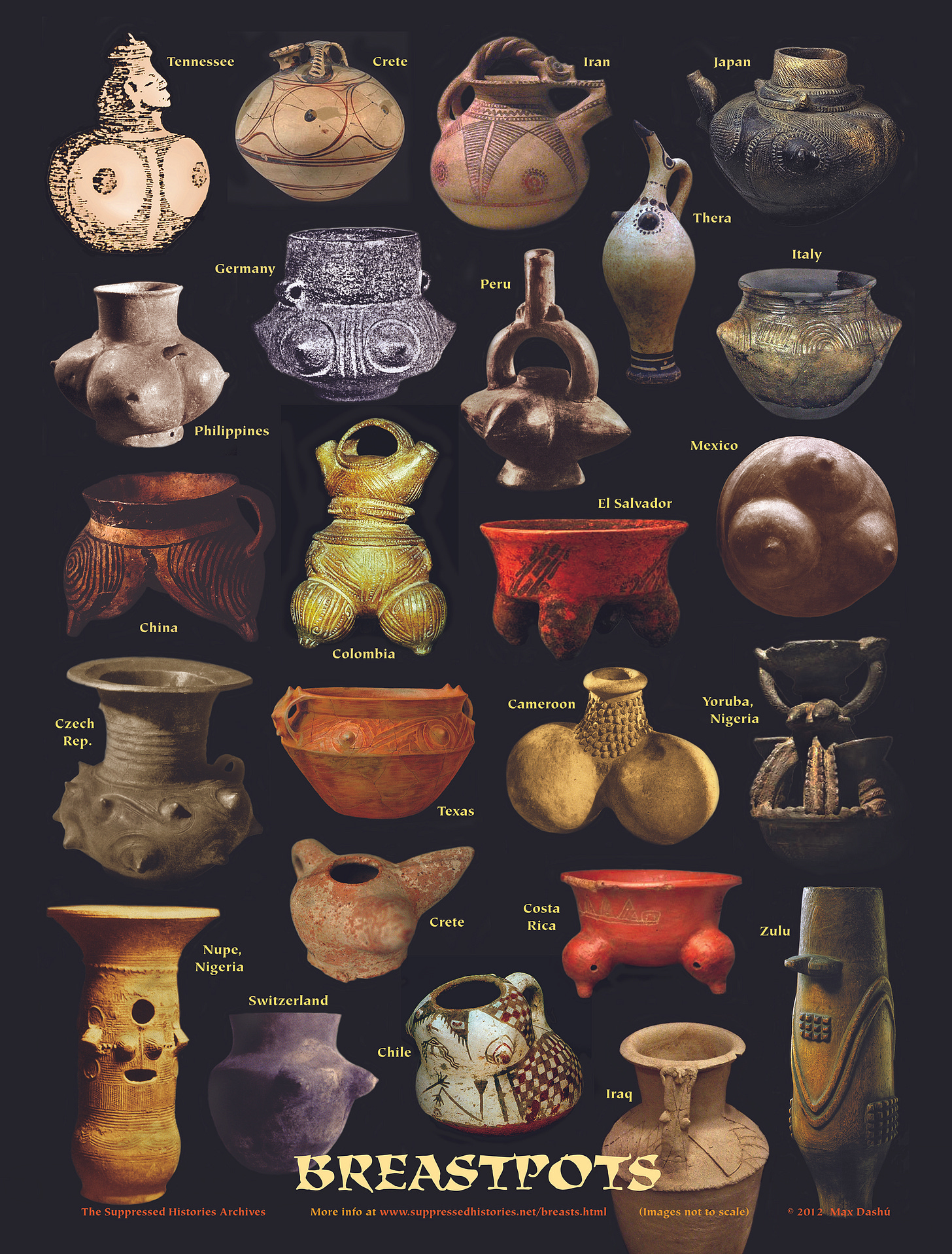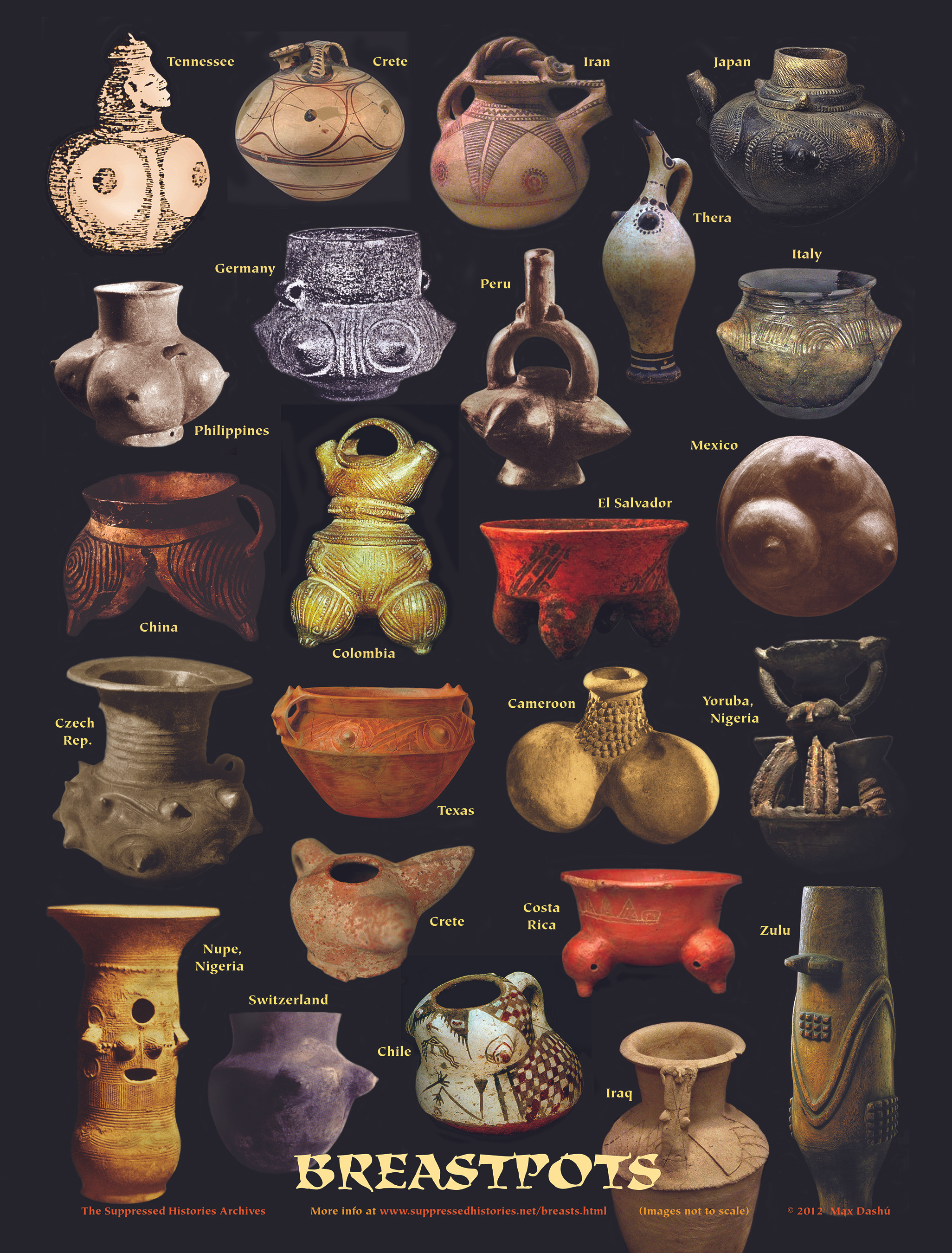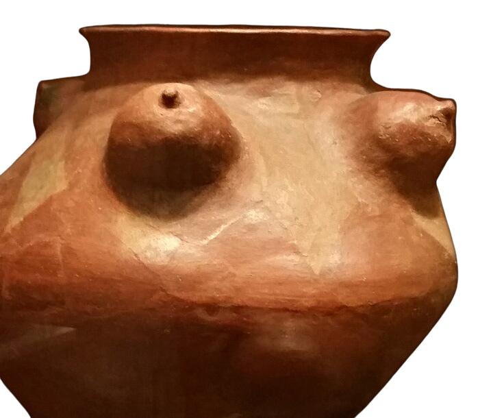 These ceremonial vessels are very widespread, as you can see from the labels, yet are rarely published. You’d never know that this many cultures revered their ancestral women this way; the blizzard of male-dominated religion, culture, media passes them over, consistently. But here they are, spanning millennia. They’ve been sequestrated to the point that few but archaeological specialists know about them. There are several kinds: breasts painted or sculpture all around the sides of the pots; breasted tripods (or often quardrupods in Central America); or a single figure whose body is the pot. Read on for identifications of each breastpot, followed by a photo gallery of more.