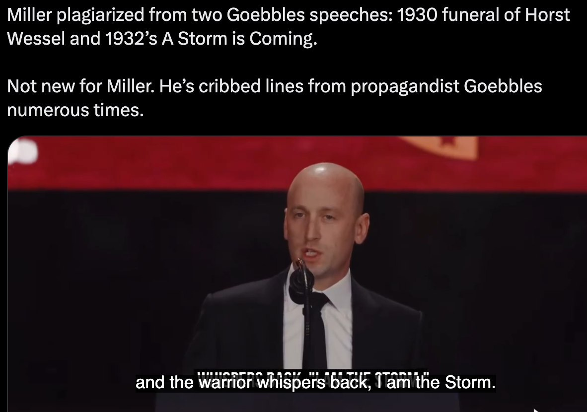 The Republican party has openly embraced fascism, using racist rhetoric against immigrants to impose military repression, and blocking all attempts to defend essential federal services like Emergency Management, the Weather Service, and medical research. Their leader is openly corrupt, selling pardons and tariff excemptions and bitcoin, and is visibly impaired, and audibly demented. The power vacuum around him is filled by powerful men whose names most people do not know, like Russell Vought, who directs the United States Office of Management and Budget. He is, as ProPublica tells us, “the architect of Trump’s broader plan to fire civil servants, freeze government programs and dismantle entire agencies.” Another eminence grise is Stephen Miller, a Nazi who likes to quote Goebbels, including a line beloved of Qanon enthusiasts: