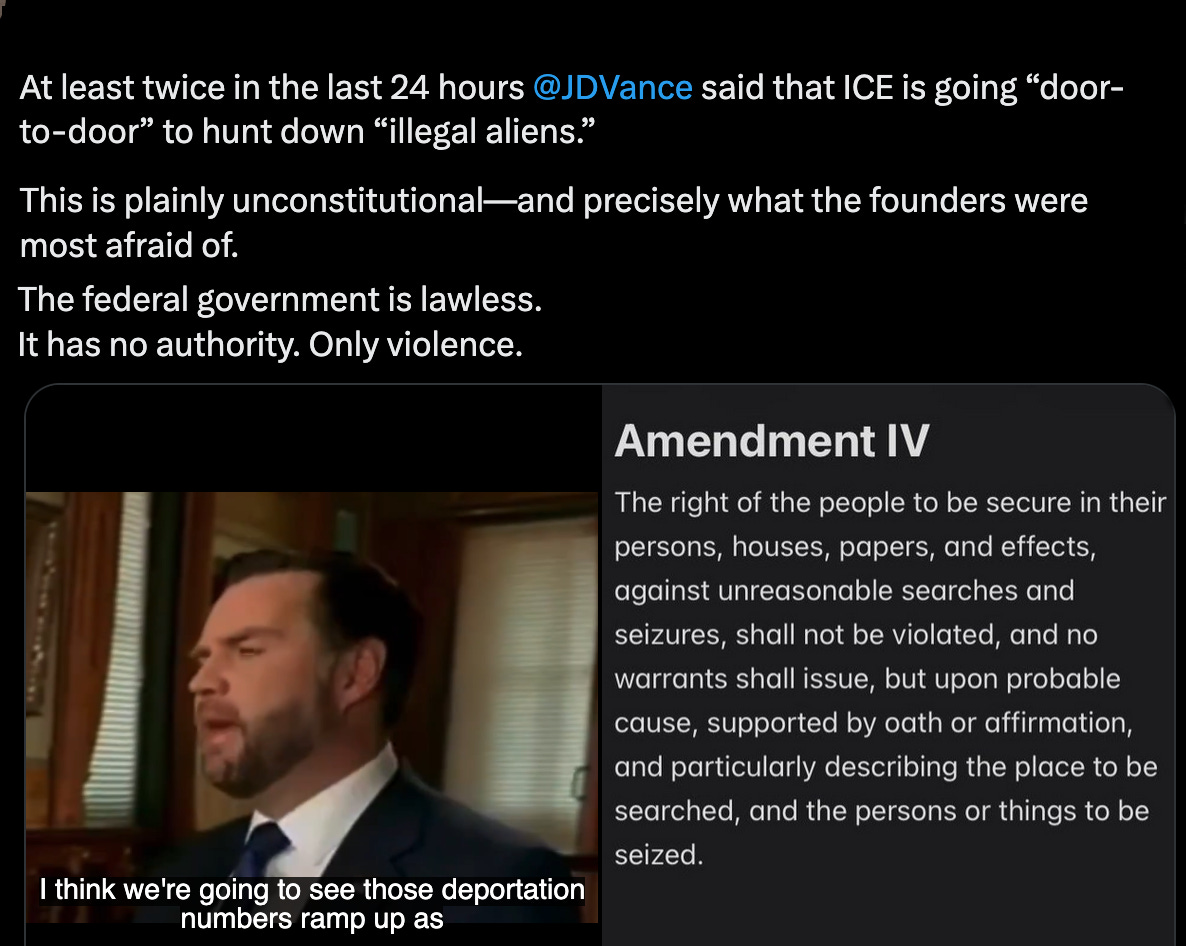 For his part, the vice president advocated for ICE to hunt down immigrants “door to door.” Of course this contravenes the 4th Amendment, but the full impact of such illegal use of arbitrary force is dramatized by the terrified mom who called 911 when ICE came after the Doordash delivery woman who ran into her house. (Good for her for protecting her, while ICE prowled around the doors and windows.) She had babies in there: “What do I do, what do I do, what do I do, I’m so scared!’