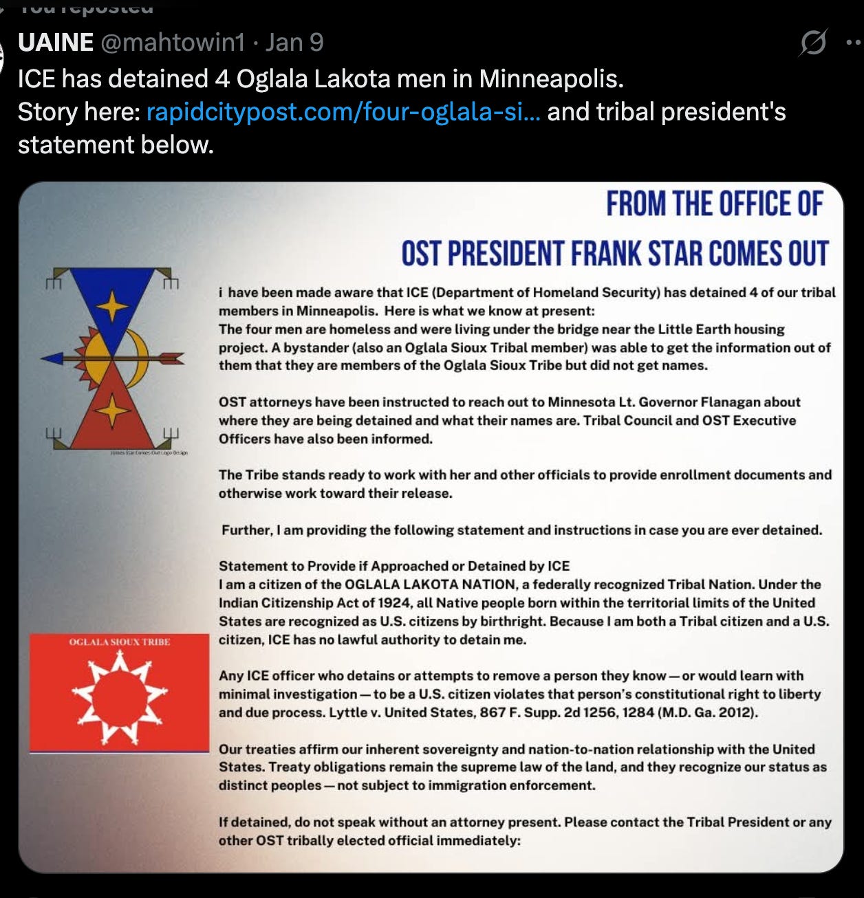 Just recently, in the wake of ICE murdering Renee Good, they went after Oglala Lakota men in a city with one of the highest Native populations in the US: