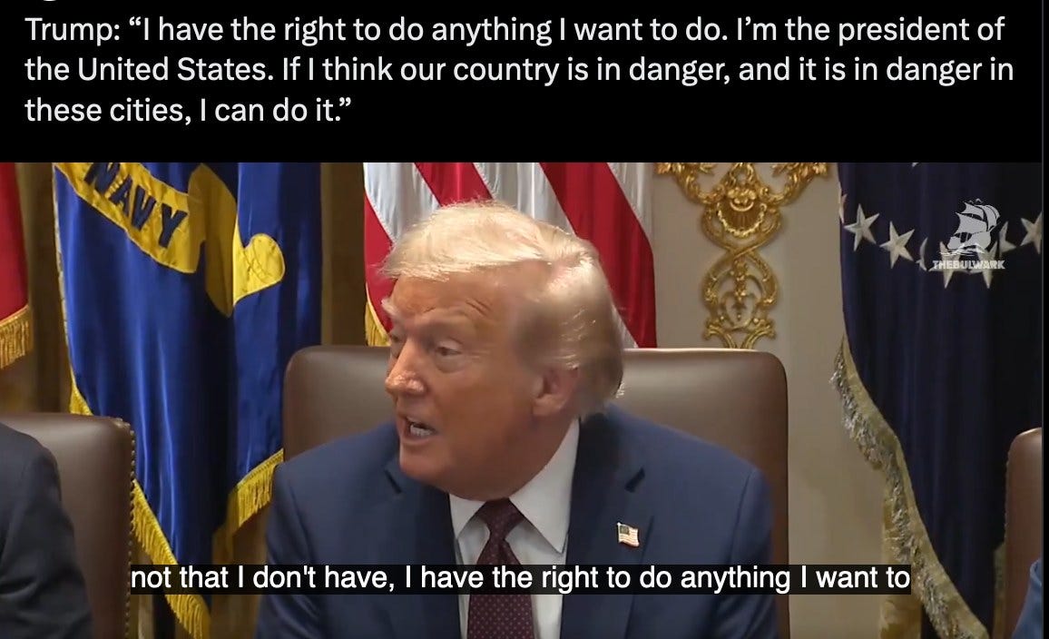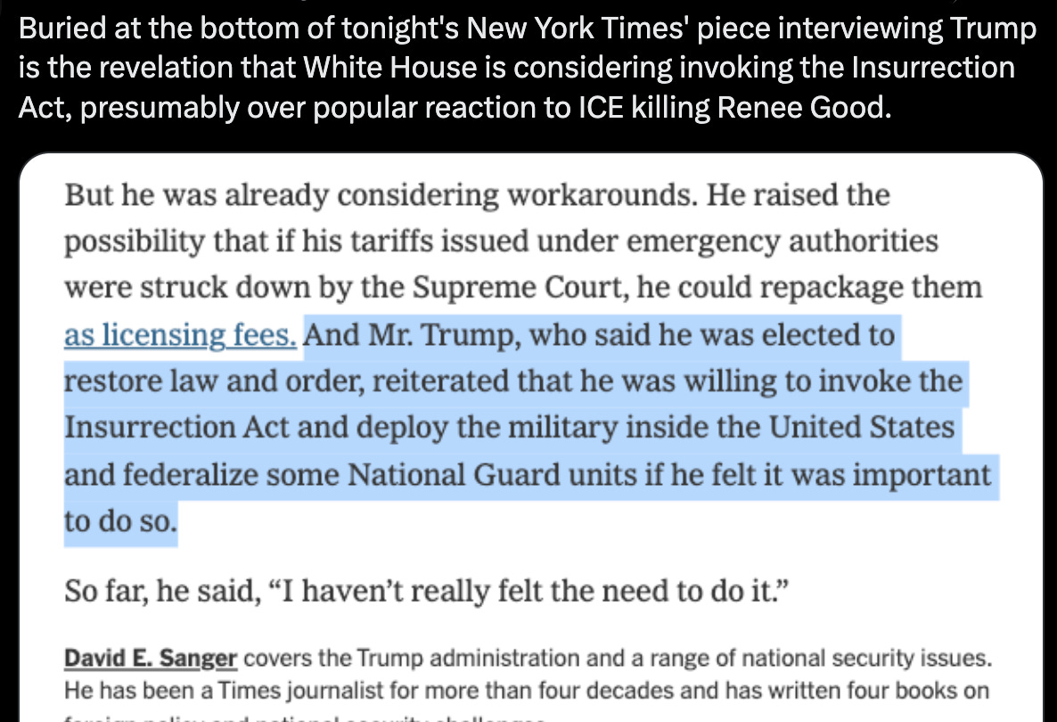 Bad as all this is, it’s worse when this terrorizing of the population is being set up as a pretext to invoke the Insurrection Act, in order to declare full martial law. Really, the Felonious Trunk has already declared his intention to do so: