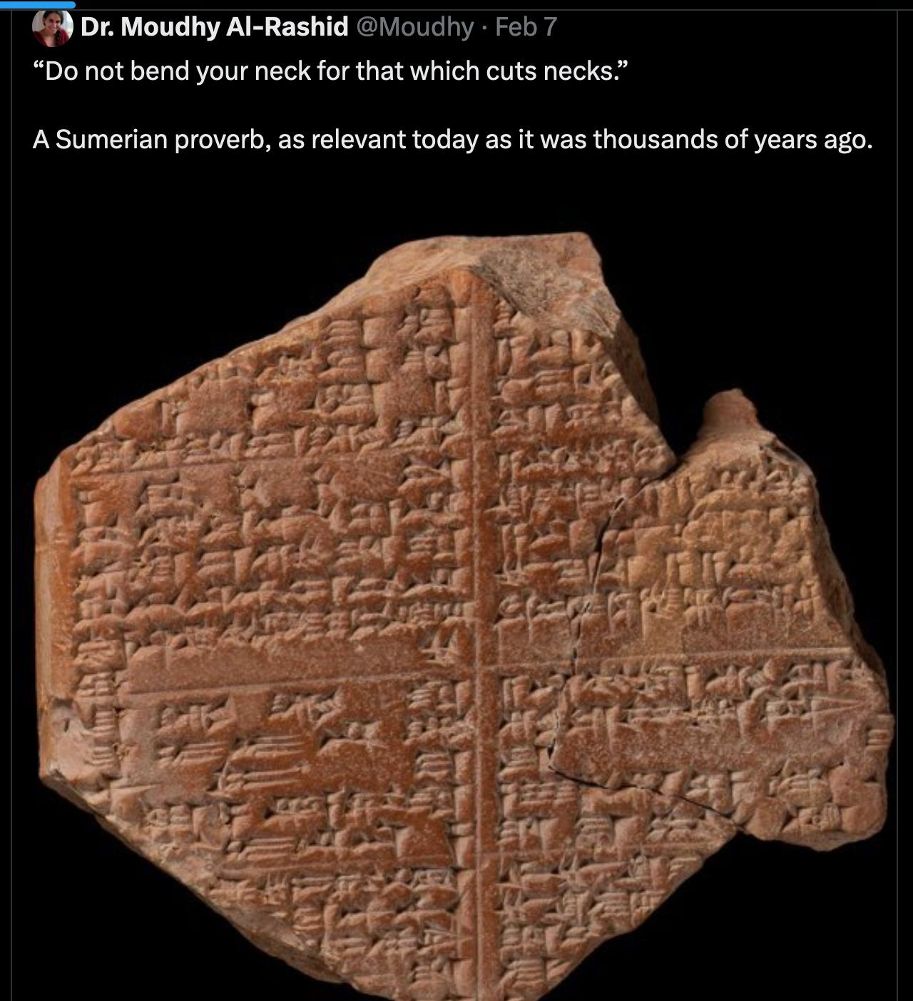 First up, an advisory from ancient Sumeria, wisdom especially to my USian cohort: “Do not bend your neck for that which cuts necks.”