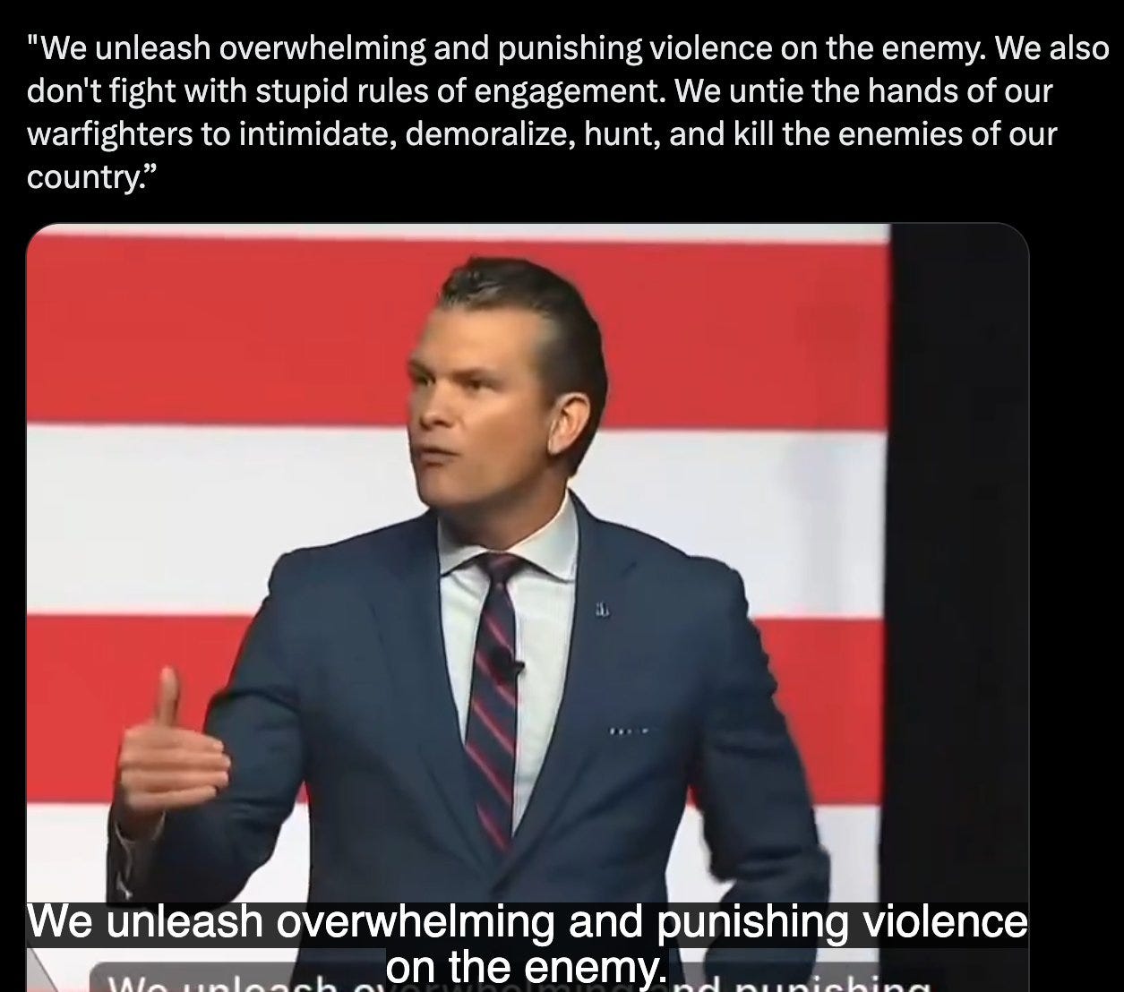 Pete Hegseth shamelessly proclaims the military dominionism. The new Secretary of War is a former Fox News guy and drunkard who sports crusader tattoos all over his body. One reads “Deus Vult,” the rallying cry in 1095 for the European invasion of Palestine. Four years later, they took Jerusalem with a massacre of Muslims, Christians and Jews. (It was witnessed by the chaplain Raymond of Aguilers, who wrote that the crusaders rode in blood that came up to their knees and even to the bridles of their horses.) Hegseth, a christian nationalist, advocates similar barbarity: