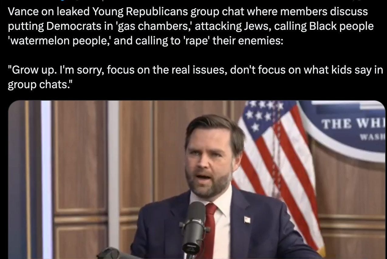 But even when a nest of young men exchanging racist and Nazi posts were uncovered among the well-heeled Republican cadre, the VP pooh-poohed it: