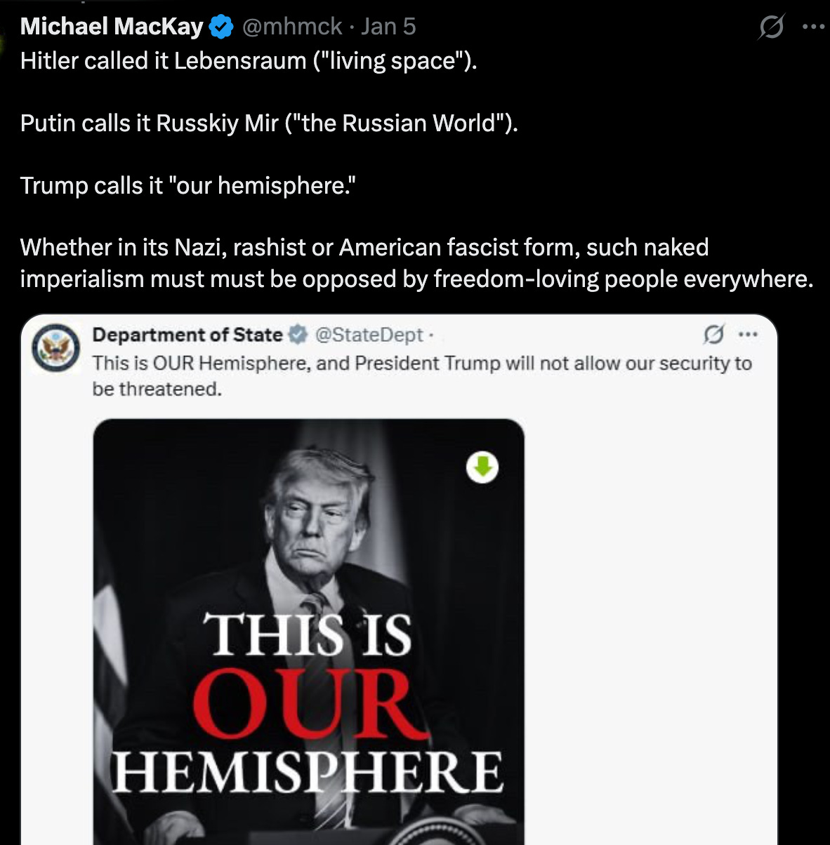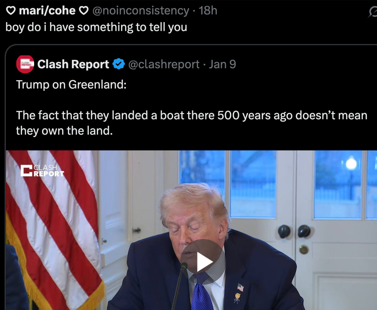 The Pedocrat has threatened Canada and European countries. He’s imposed tariffs that disrupt the world economy and are crashing the US supply chain, causing Farmageddon. He has tried to coerce Zelensky who is fighting the Russian invasion of Ukraine. He’s bombed Venezuelan boats, invaded the country, and kidnapped its president, while declaring that he “will run” the country and appropriate its oil wealth. He’s declared his intention to take over Greenland, either by “buying” it, or “do it the hard way,” by invasion. Below, he refers to Danes colonizing the island, with no trace of awareness that the US was colonized in the same way: