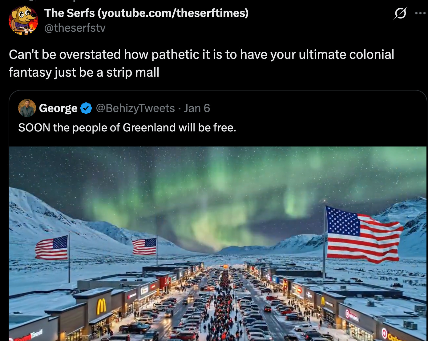 Damn, just while I was writing this, Syrian Islamist regime is massacring Kurds in Aleppo, under the guy Trump welcomed with smiles a couple months ago. And its hated Shi’a counterpart has opened fire on protesters in Iran, killing hundreds, possibly thousands of people. Also, Trump tried to get UK and EU to sign off on his attempt to take over Greenland, and they refused. They’re now sending ships to defend it.