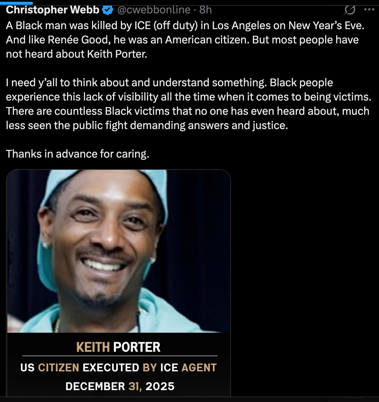 Renee Good is not the first person to be murdered by an ICE goon. On New Years Eve in Los Angeles, an off-duty ICE thug killed Keith Porter Jr., with no media coverage: